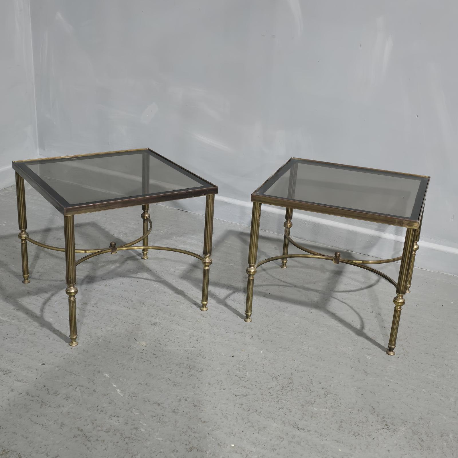 A very nice pair of French brass Maison Jansen style lamp tables with smoked glass tops, in overall very good condition.