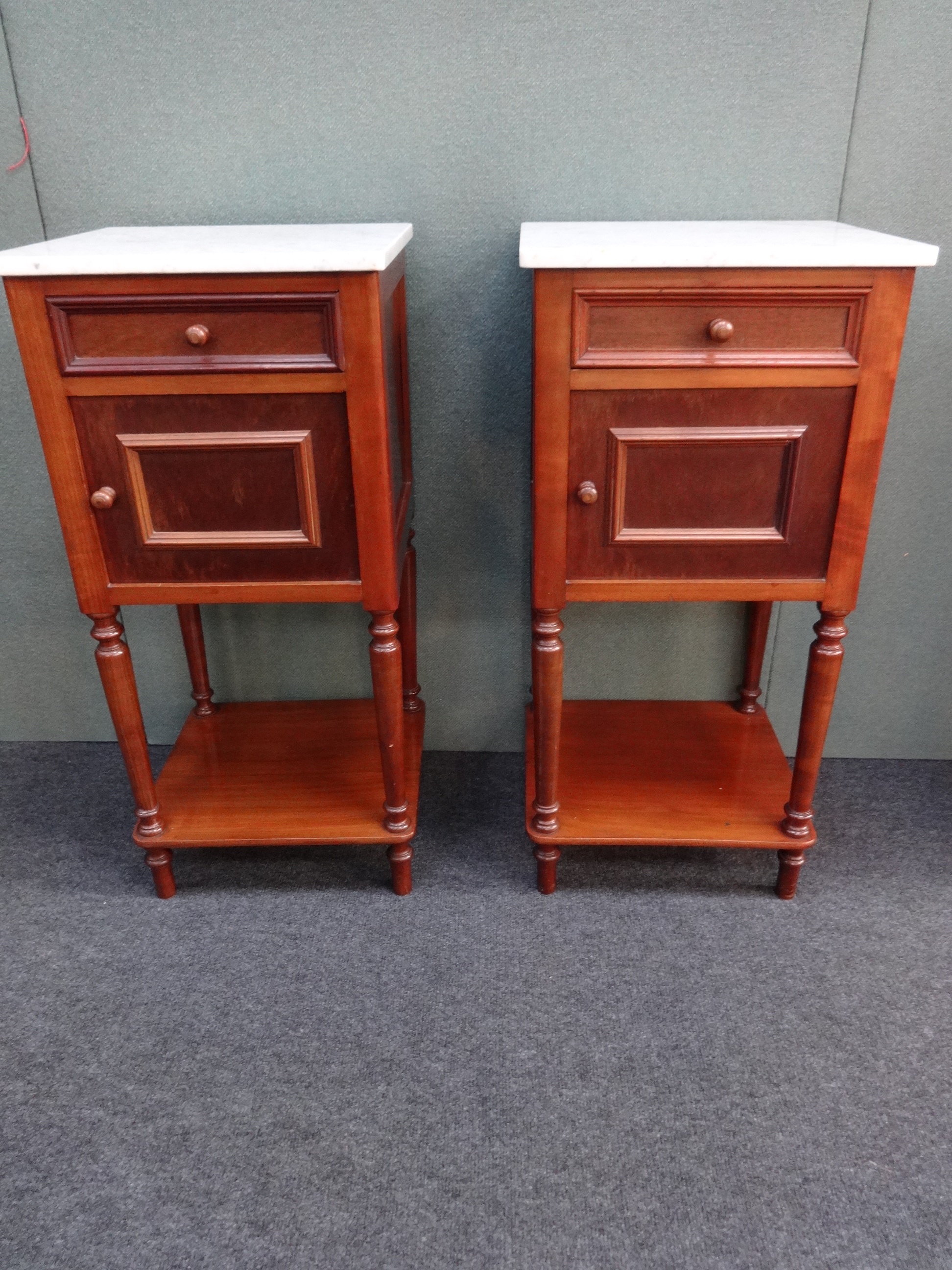 Offered for sale are these fantastic mahogany cabinets that each has a single drawer and door with white marble tops. In very good condition.