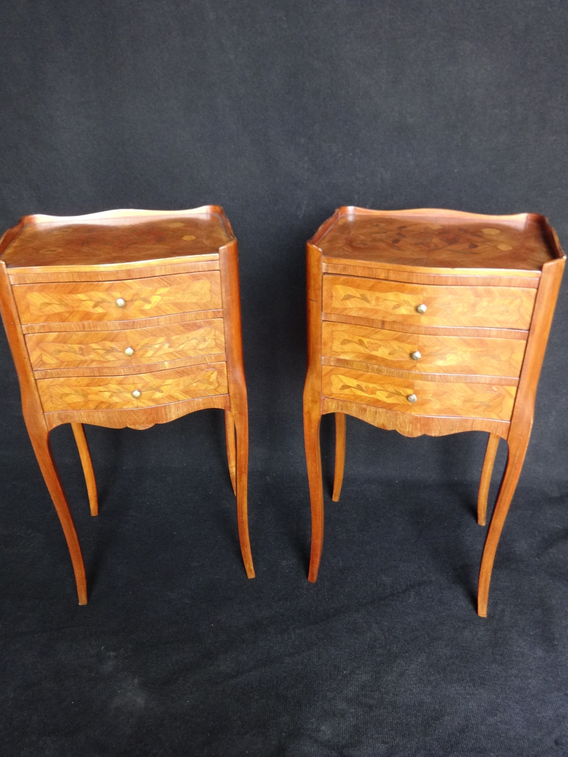 Offered for sale are these fabulous pair of French marquetry bedside cabinets each with 3 drawers, a tray top and serpentine fronts. They stand on tall cabriole legs.