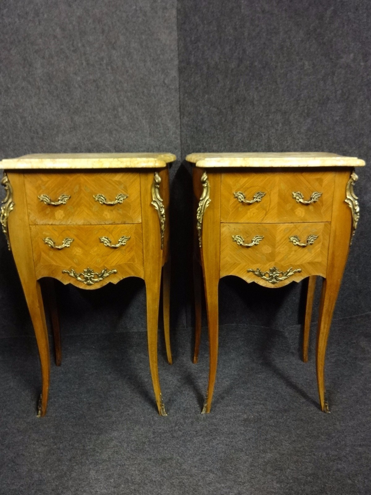 Good marble tops, serpentine chest of 2 drawers, ormolu toes, knees and handles, marquetry flowers. in very good condition.