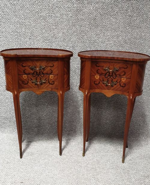 A wonderful pair of French kidney shaped tulipwood bedside lamp chests of drawers, with two oak lined marquetry fronts, brass handles and toes. Excellent colour and condition.