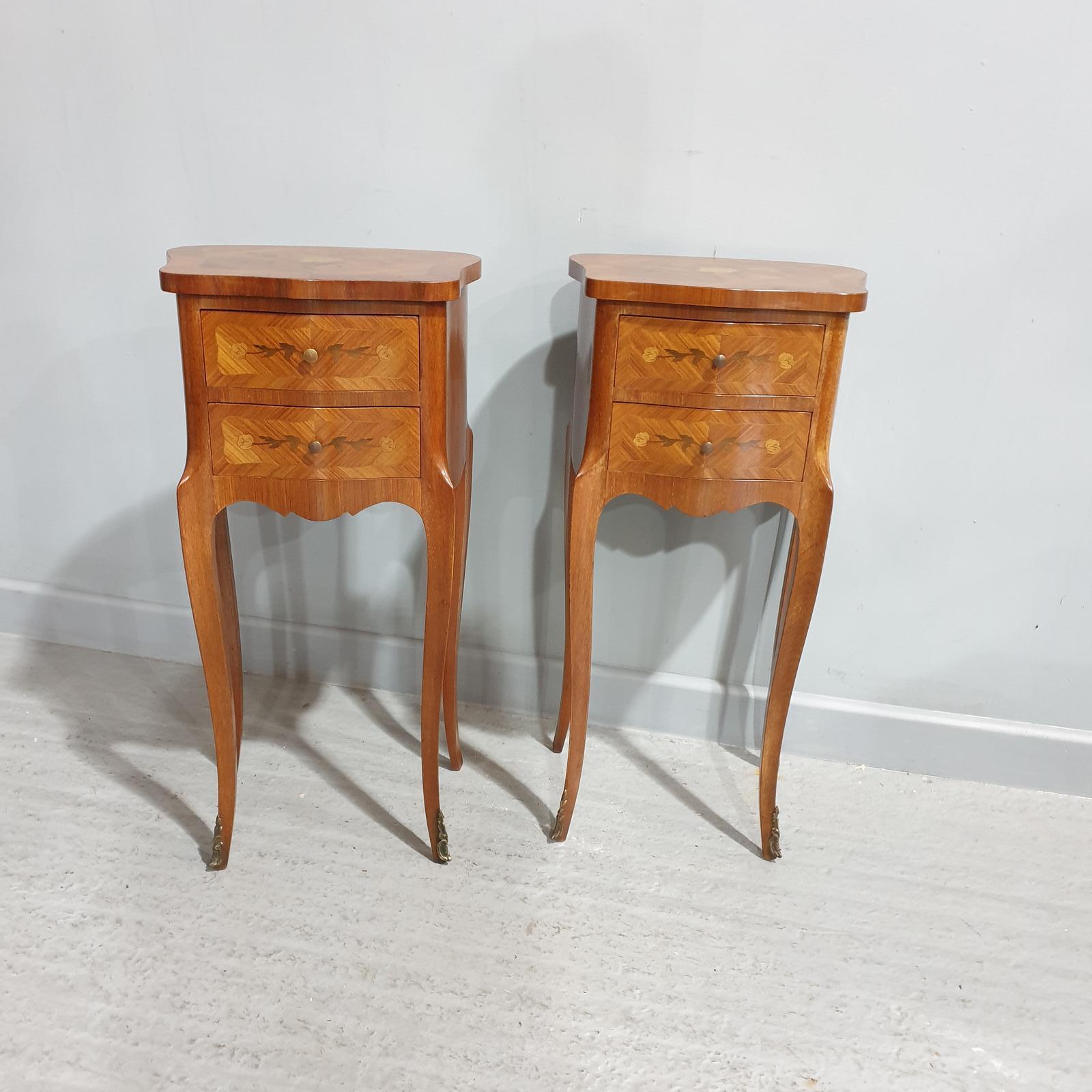 A very nice pair of French tulipwood and marquetry inaid bedside lamp tables, ormolu handles and feet, in excellent overall condition.