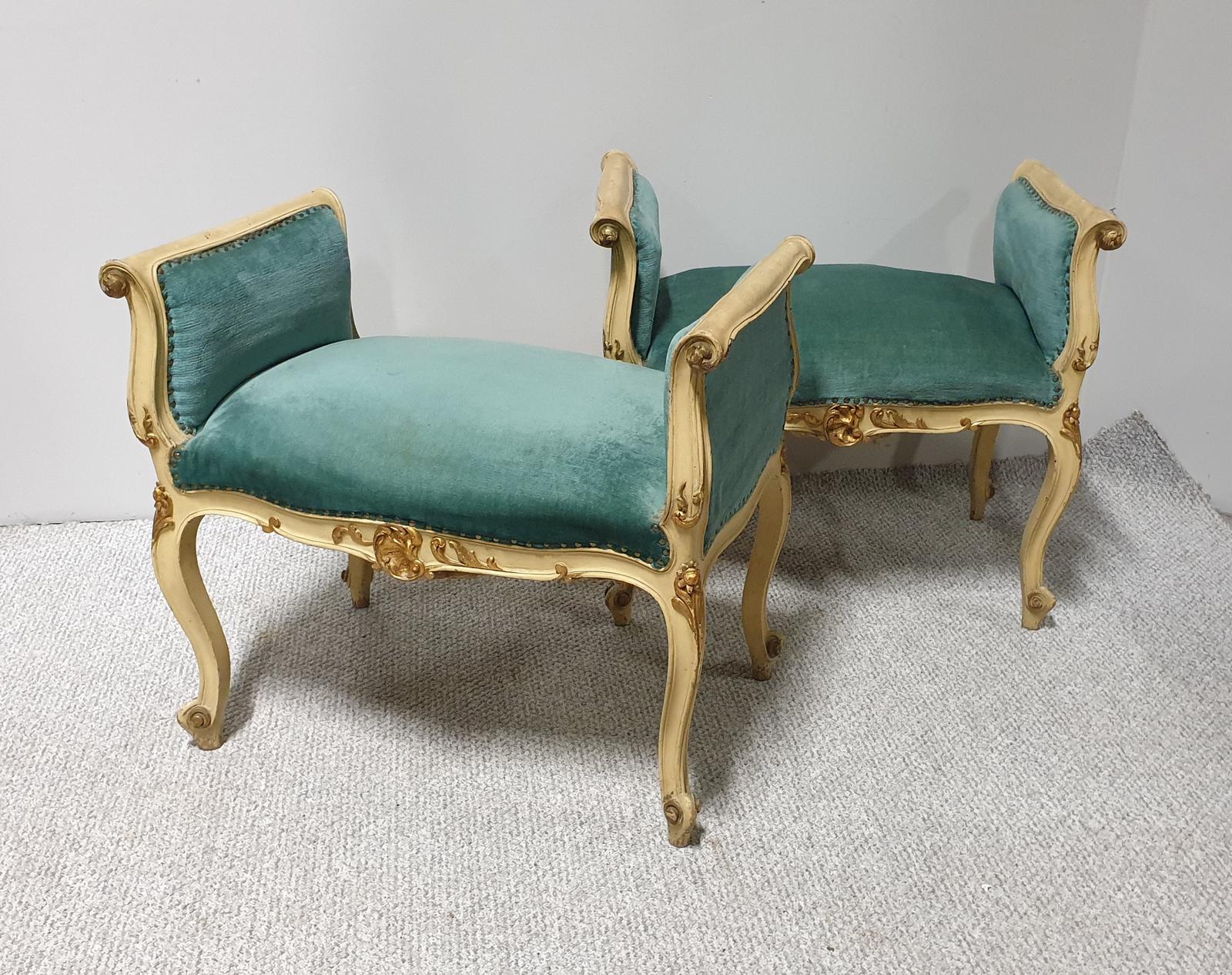 A wonderful pair of original French painted and parcel gilt window seats with original teal plush velvet upholstery, in excellent condition.