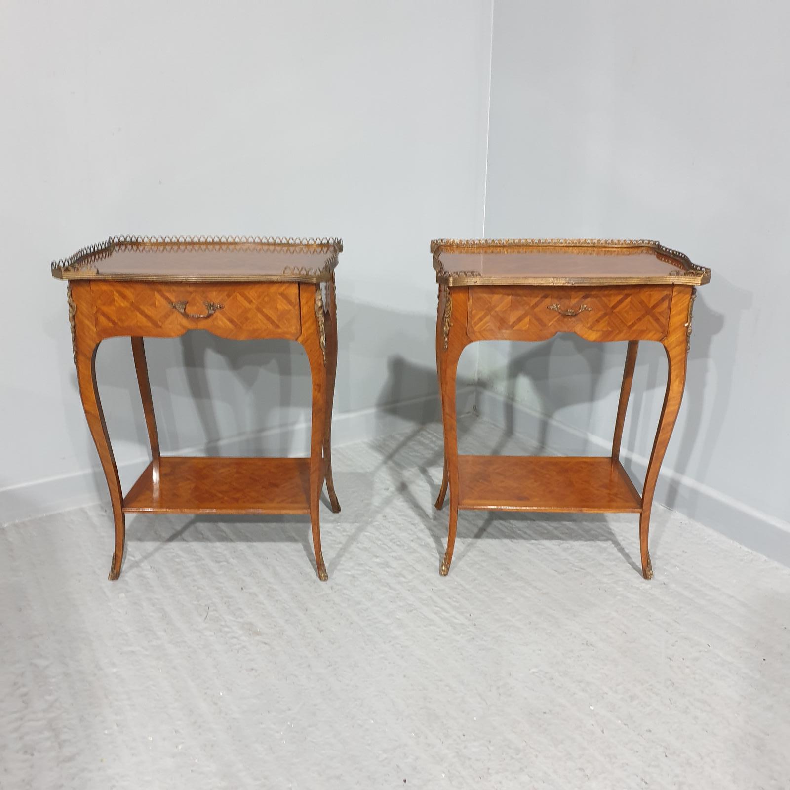 These are a super pair of French tulipwood parquetry side tables or bedside tables, the tables are an exact match but the knee and rim ormolu is slightly different, in overall excellent condition.