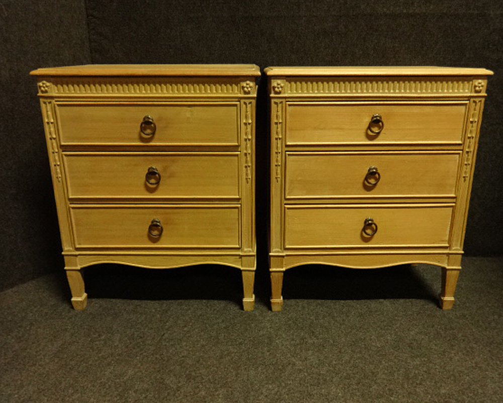 These are a good pair of French antique bedside chests, three drawers, brass handles, bellflower decorations, standing on spade feet, in very good condition.