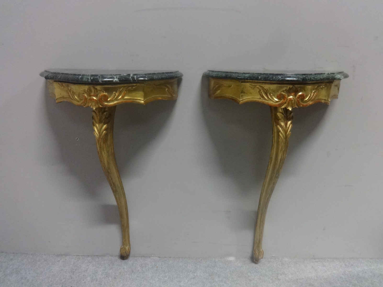 A very good pair of gilt console tables with single drawer, green variegated tops, in very good original condition.
