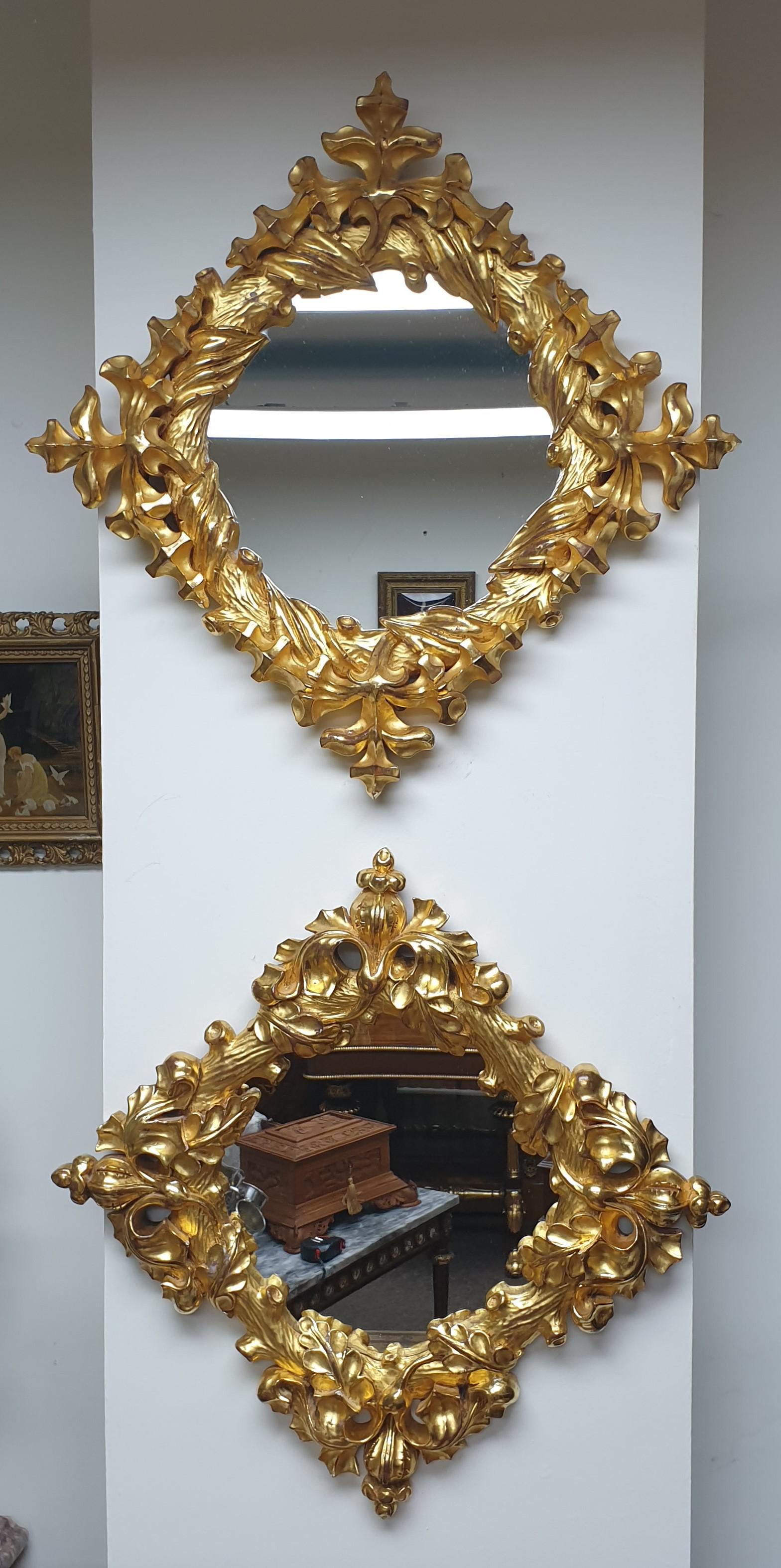 Wonderful pair water gilded diamond shaped wall mirrors, one with laurel leaves the other with oak leaves, bark effect, can be hung square, in excellent condition.