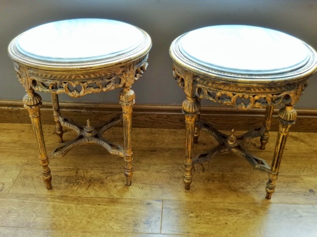 This is a good pair of gilt wood lamp tables with grey veined marble tops, in excellent condition.