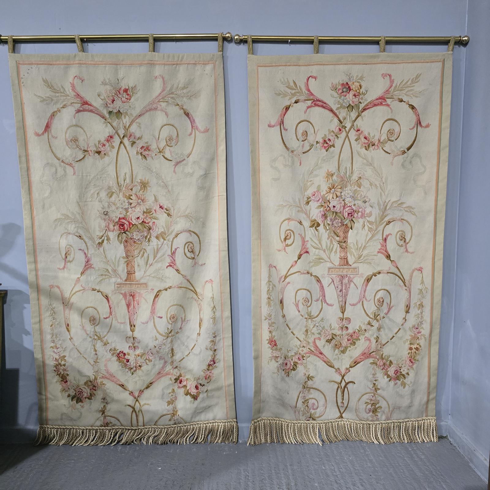 Wonderful and huge pair of fully lined C19th wall hanging tapestries, attached to brass poles, ending in deep bullion fringing, in overall very good colour and condition.