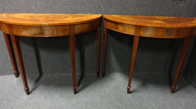 A very good pair of mahogany console tables inlaid with satinwood, rosewood and tulipwood, recently the tops have been re French polished, standing on spade feet, in excellent condition.