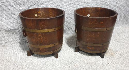 A very nice pair of large oak Planters or log bins by Lister & Co, banded with copper with copper rivets and handles. In excellent condition.