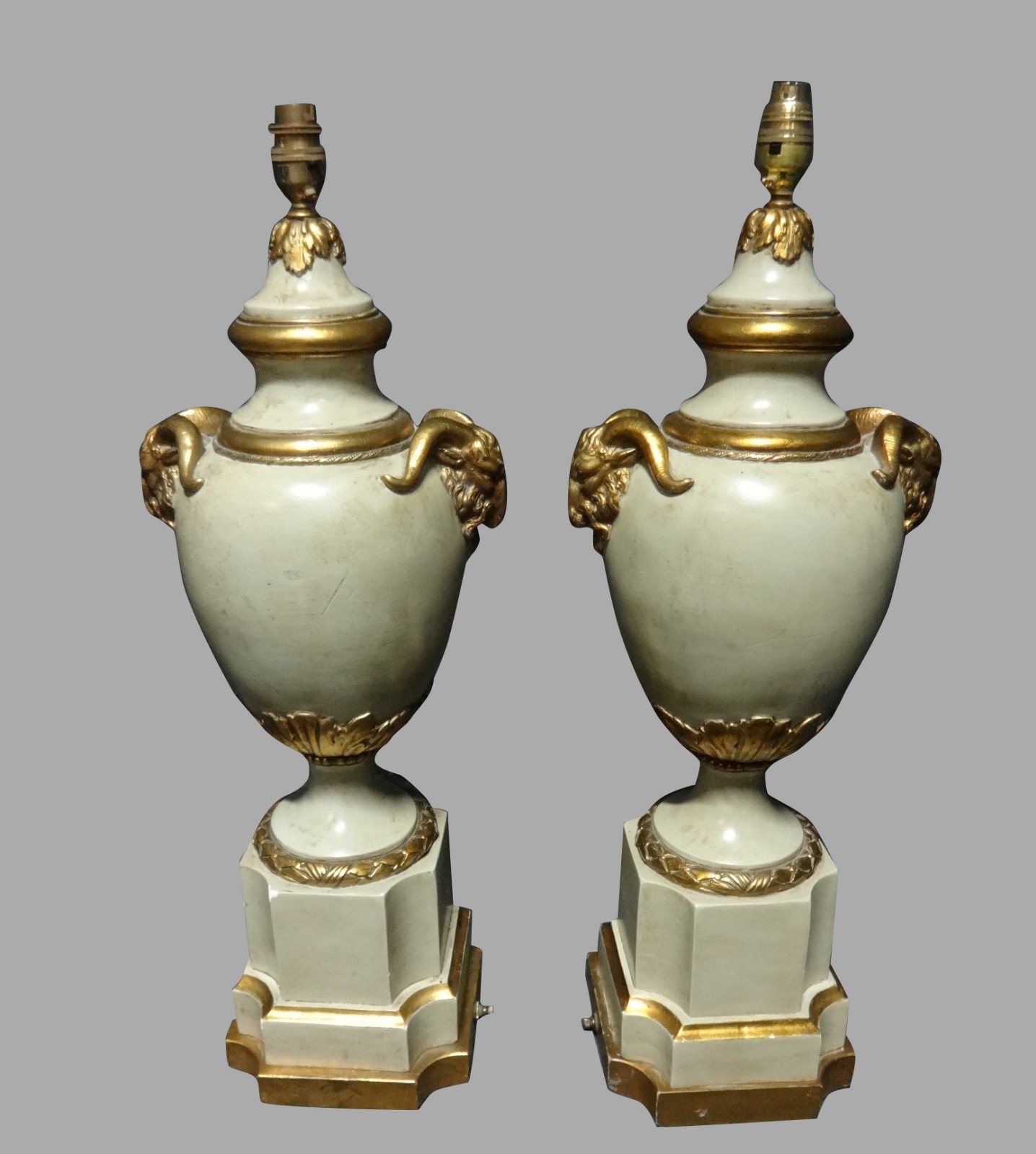 This is a wonderful and large pair of French wooden table lamps, with gilt decoration and rams heads., rewired and tested.