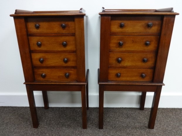 These are a good pair of mahogany bedside chests, turned wooden knobs, mahogany lined, in excellent condition.
