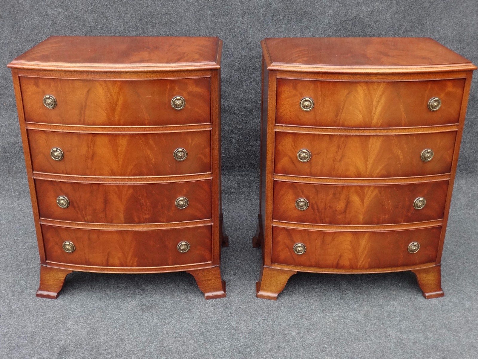 Offered for sale are these fantastic pair of solid mahogany bowed 4 drawer bedside chests which can also be used as lamp tables.