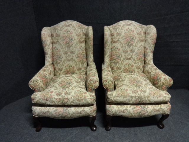These are a very good quality pair of mahogany framed winged arm/easy chairs, original tapestry covering in very good condition.