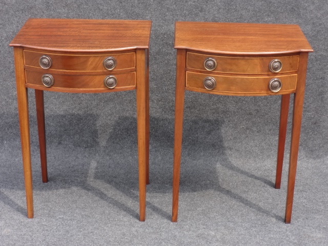 This is a good pair mahogany bowed 2 drawer tables, each with boxwood inlay, in excellent original condition with brass ring handles.