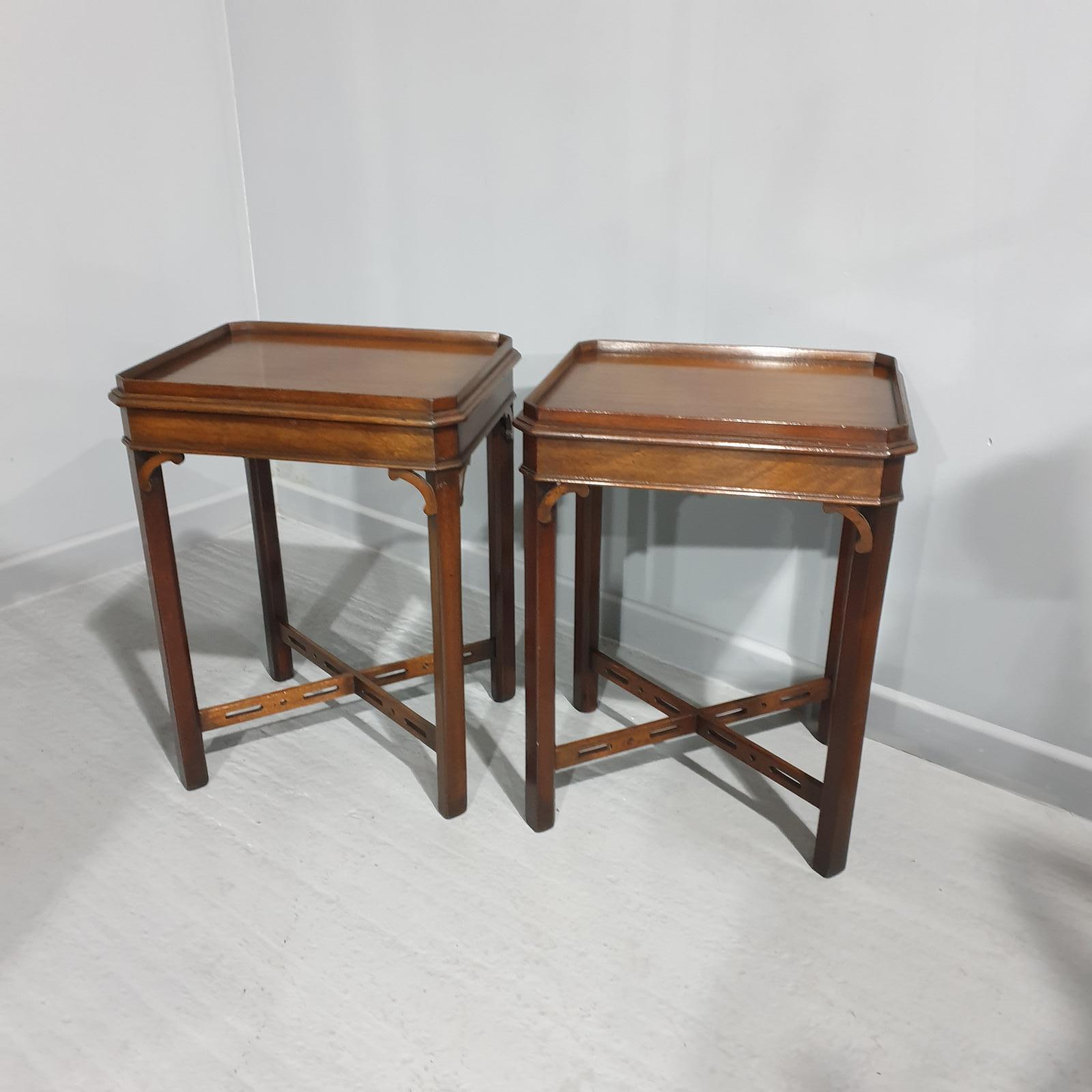 Fine pair of English mahogany lamp tables with pierced under stretcher and tray tops, in overall very good colour and condition.