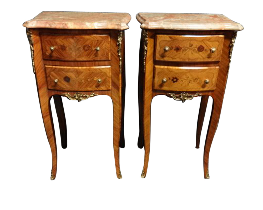 These are a very good pair of kingwood bedside chests with marquetry fronts, ormolu mounts and very good marble tops, in excellent condition.