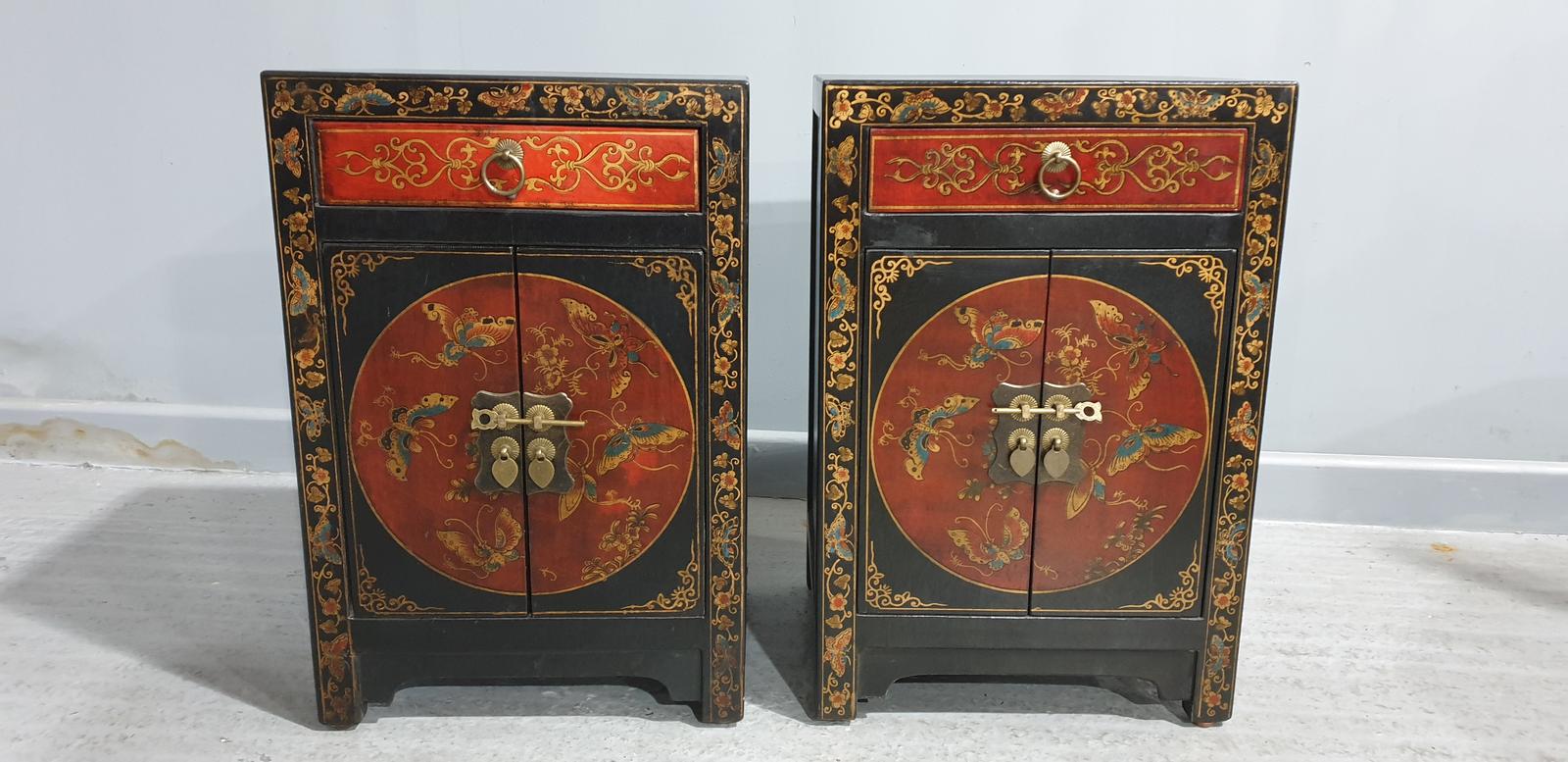 These are a very nice pair of Oriental bedside lamp cabinets with single drawer and opening doors with original brass locking pin, excellent condition.