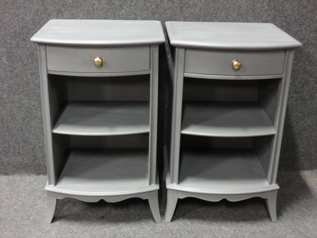 These are a good pair of painted bedside cabinets, with bowed fronts. They stand on outswept legs.
