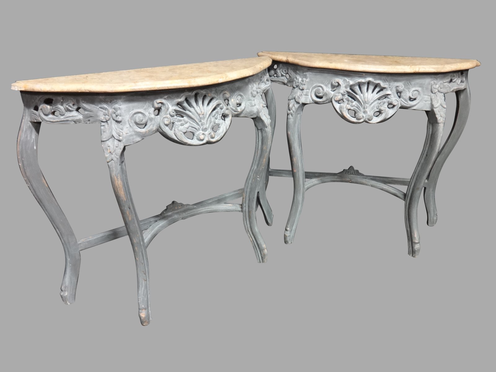 These are a very good pair of grey painted console tables with original cream mottled marble top, in very good condition.