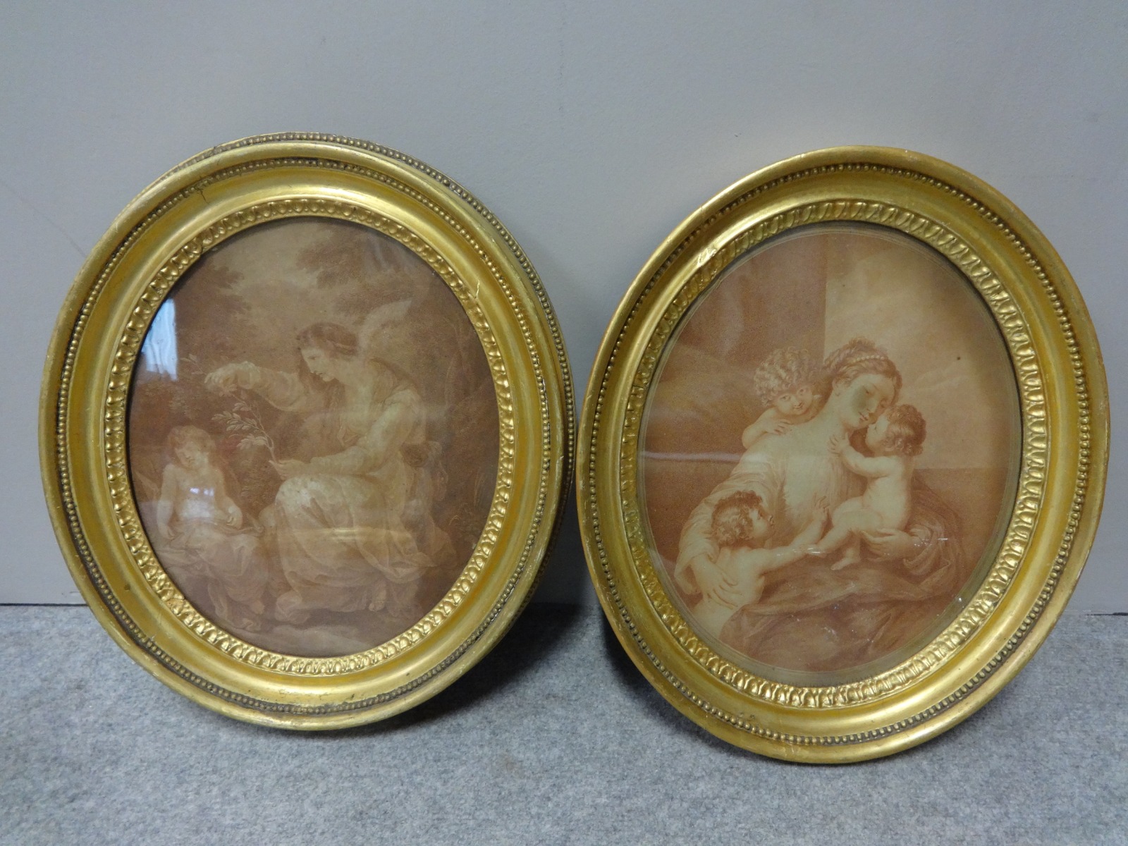 A good pair of 19th Century Regency antique engravings with titles Cleone and Charity in original gilt frames.