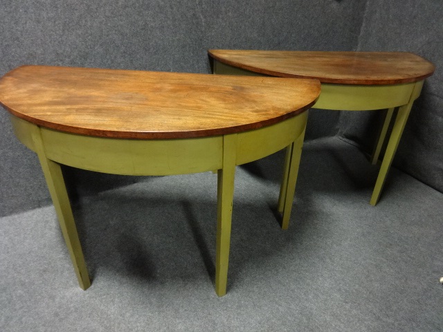 These are a pair of 19th Century Regency antique painted console tables with waxed mahogany tops, in very good condition.