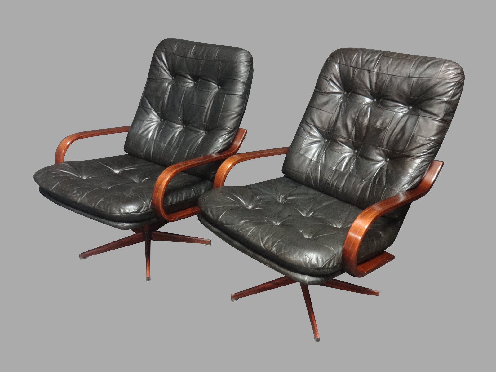 These are a very good pair of bentwood swivel chairs with black leather buttoned seats, standing on faux rosewood base, extremely comfortable, in excellent condition.