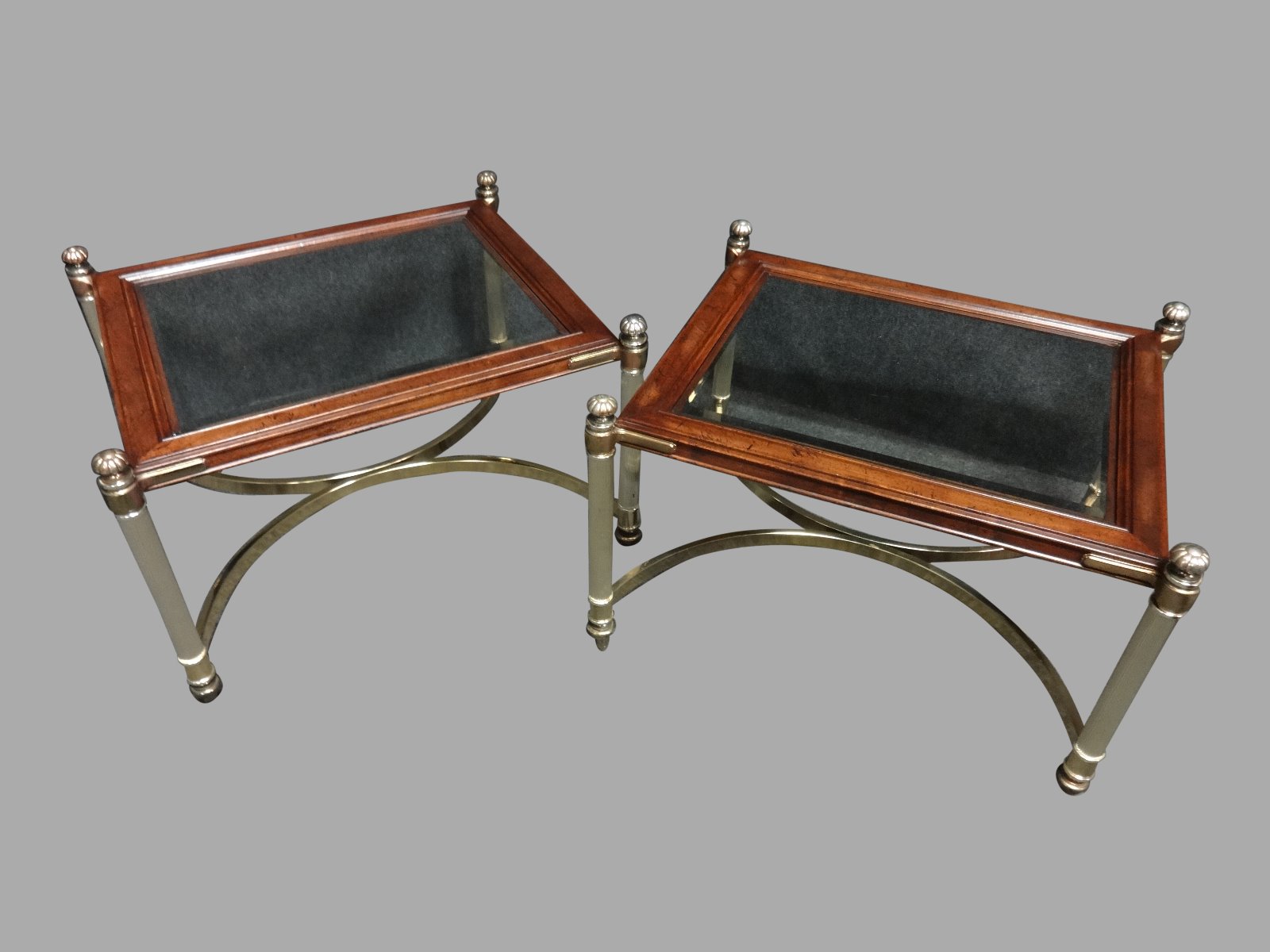 These are a very good pair of retro brass, glass and mahogany end table, coffee tables, in very good condition, bevelled glass insets, small chip on one corner.