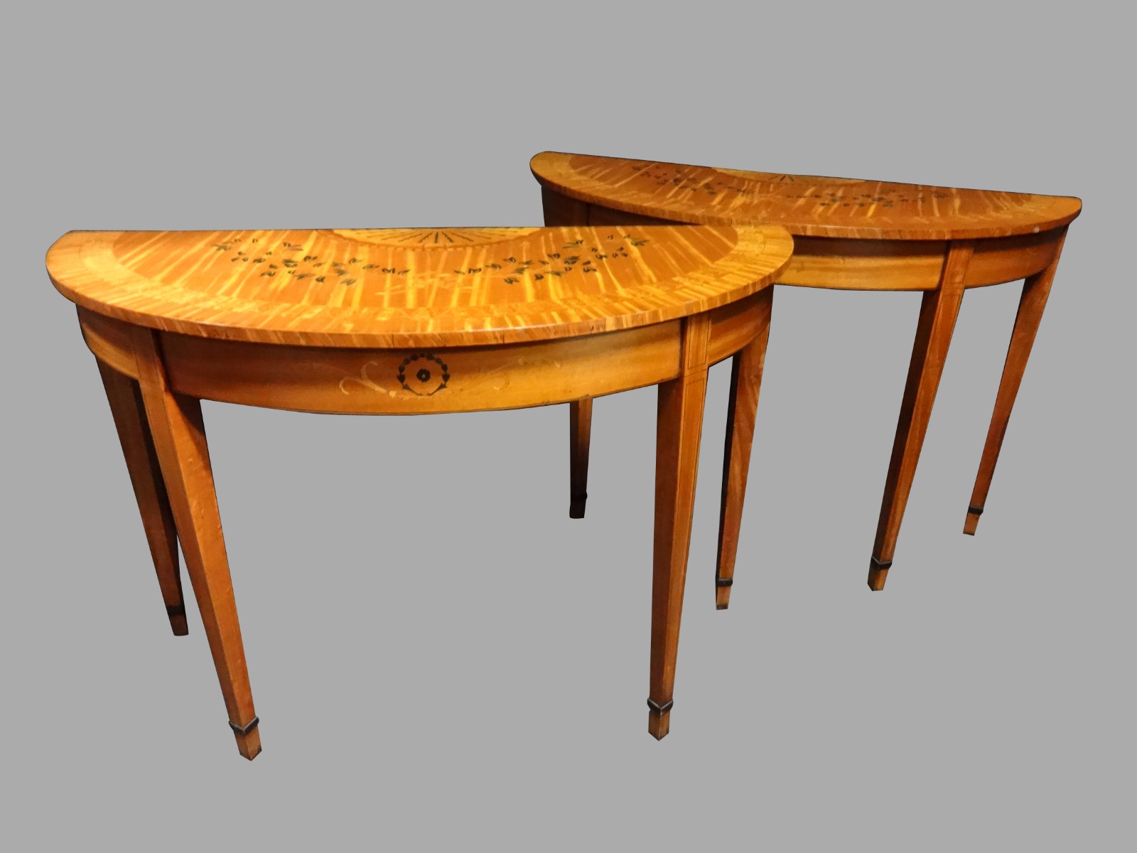 These are a good pair of satinwood console tables with inlaid freize and marquetry tops, in very good condition.