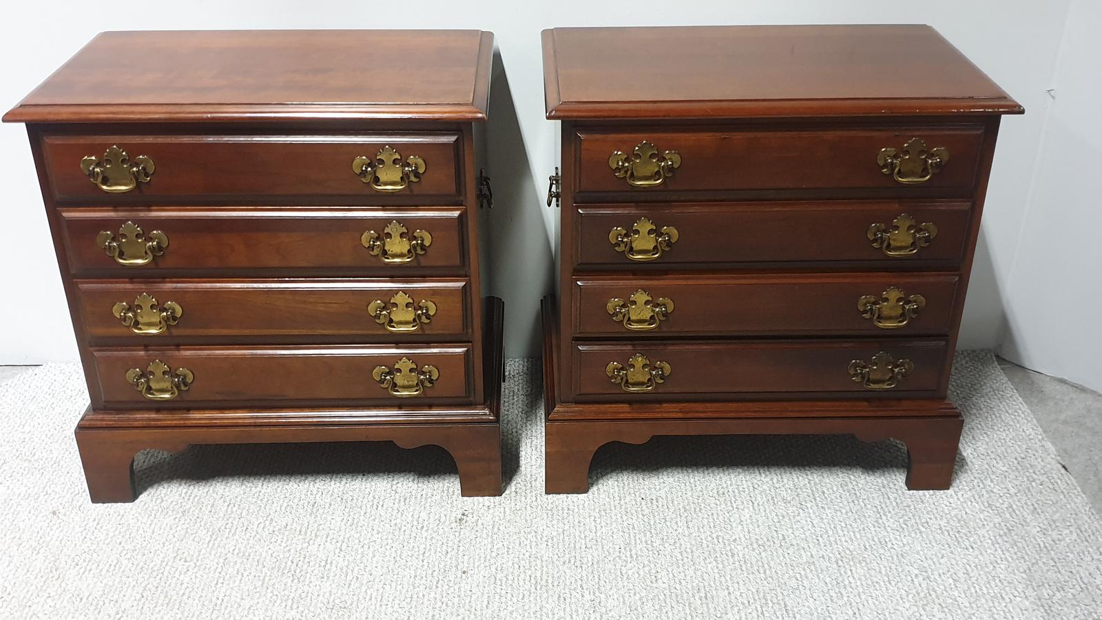 A very good pair of solid mahogany four drawer bedside lamp chests with brass handles and carrying handles, standing on bracket feet and in excellent original condition.