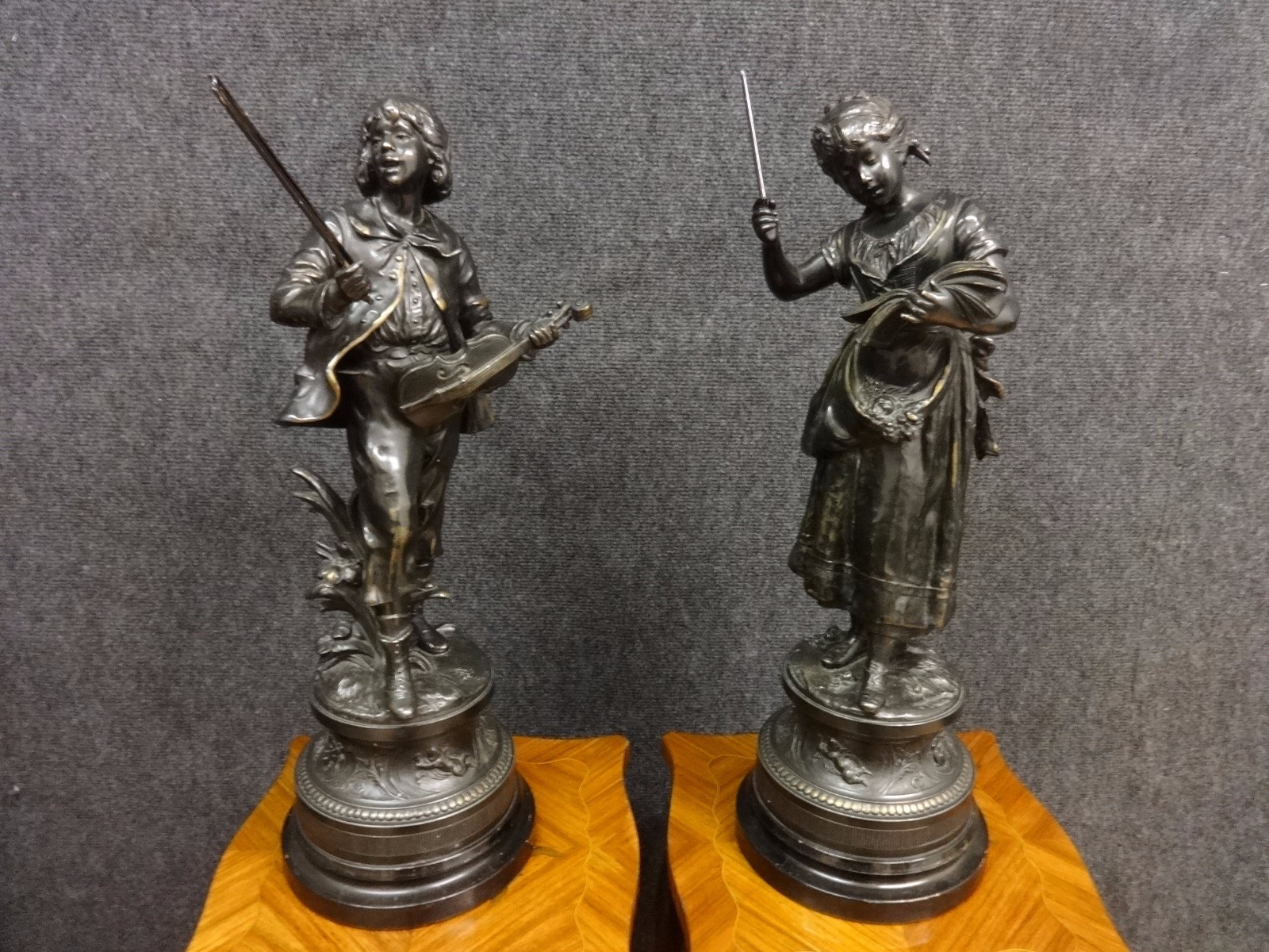In excellent condition, a pair of spelter bronzed musicians, signed 'Morreau', standing on circular wooden bases in perfect condition.