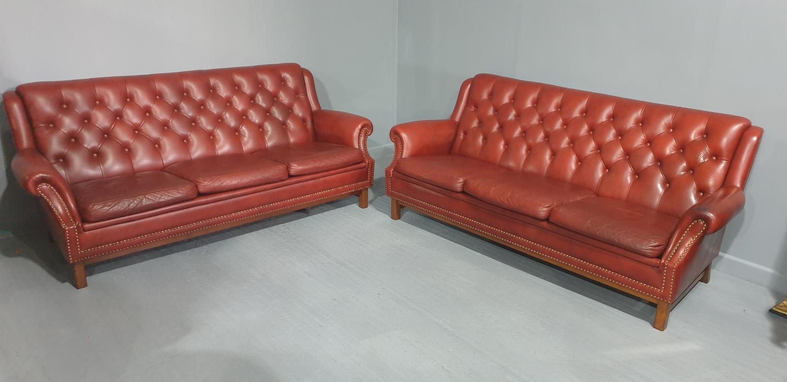 For sale are these pair of red leather deep buttoned back sofas by Stjernmobler Sweden, single studded beech framed, loose cushion, in overall great original condition.