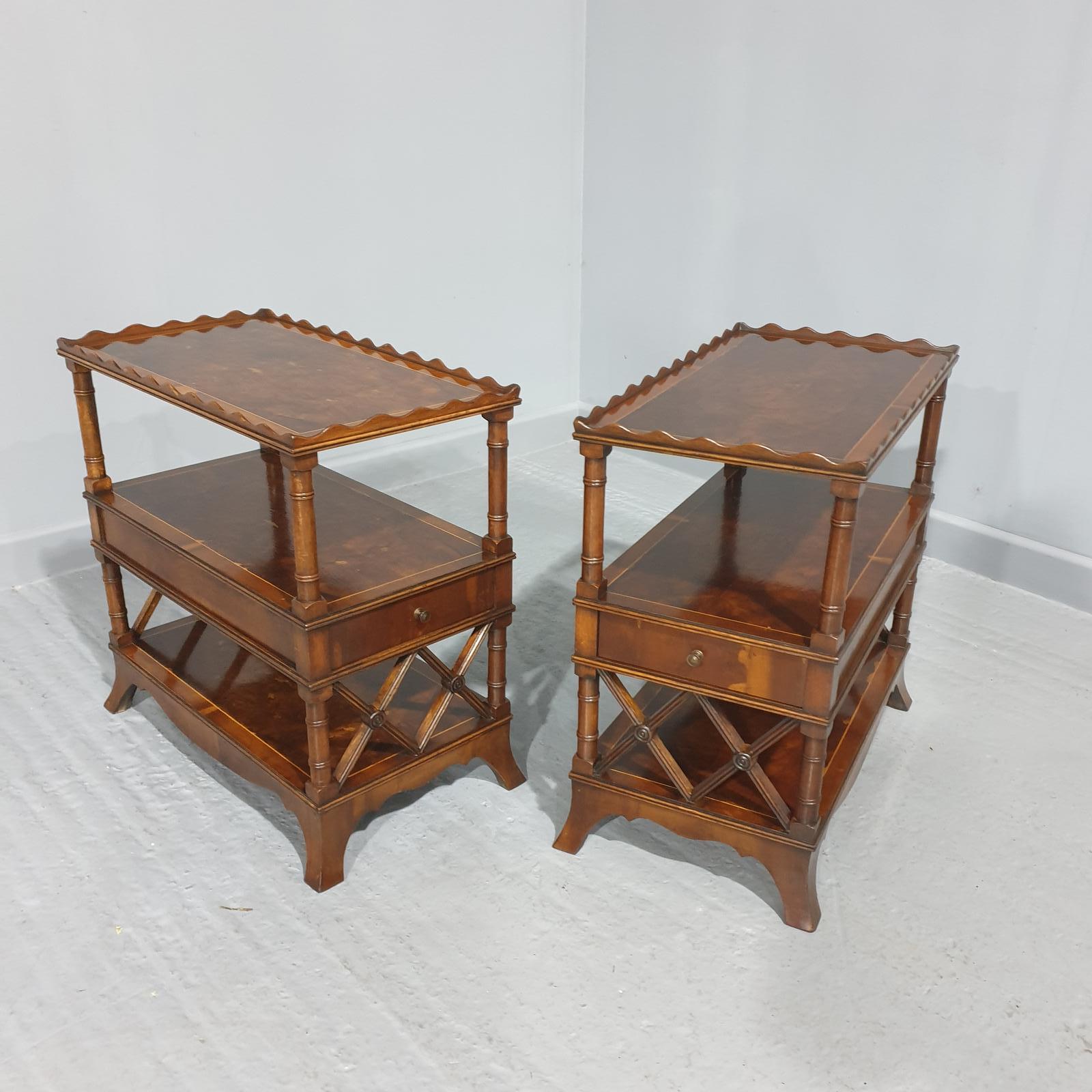 A super pair of scolloped tray topped end tables each with a full depth single drawer, X detailing to the ends, three tier, in very good original condition and standing on splayed feet.