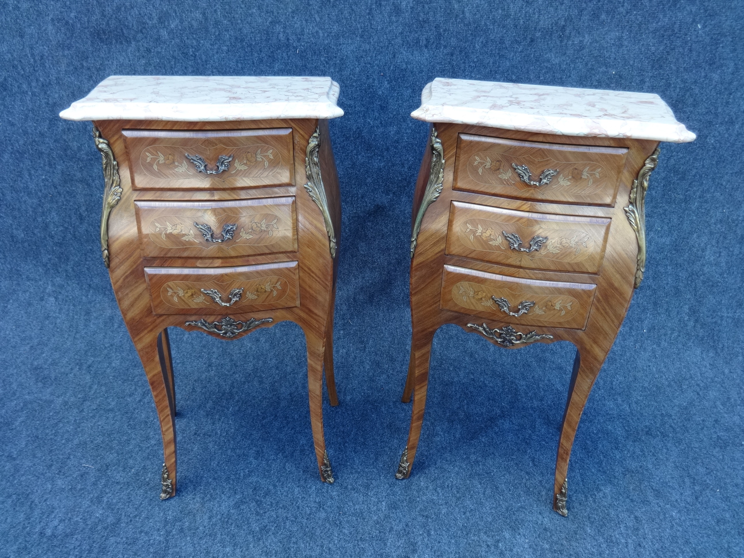 Inlaid with marquetry flowers, this is a good pair of French tulipwood bedside chests with ormolu handles, feet and shoulders, bombe shaped each with 3 drawers and very good quality marble tops. It is in excellent original condition.