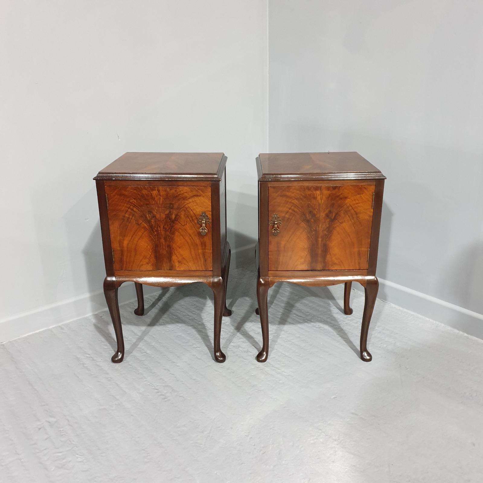 These are a super pair of early 20th Century antique walnut bedside lamp cabinets, left and right, standing on cabriole legs in excellent condition.
