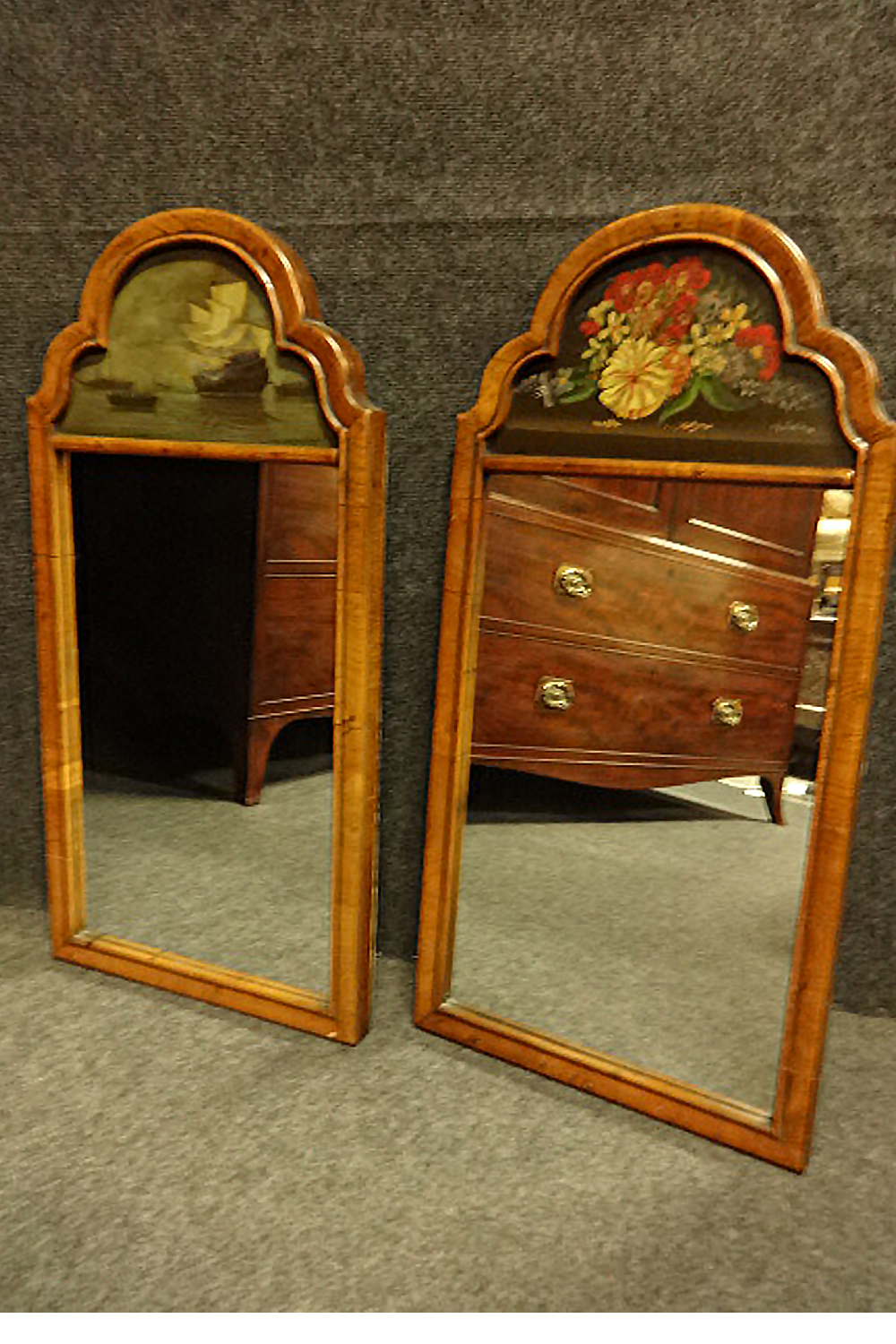 These are a good pair of Queen Anne style walnut framed mirrors with painted friezes, in very good condition.