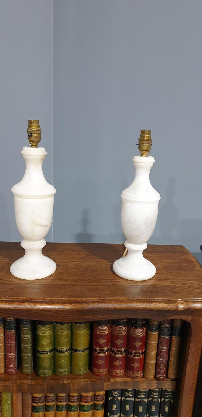 These are a very nice pair of white urn shaped marble table lamps, required and ready for use.