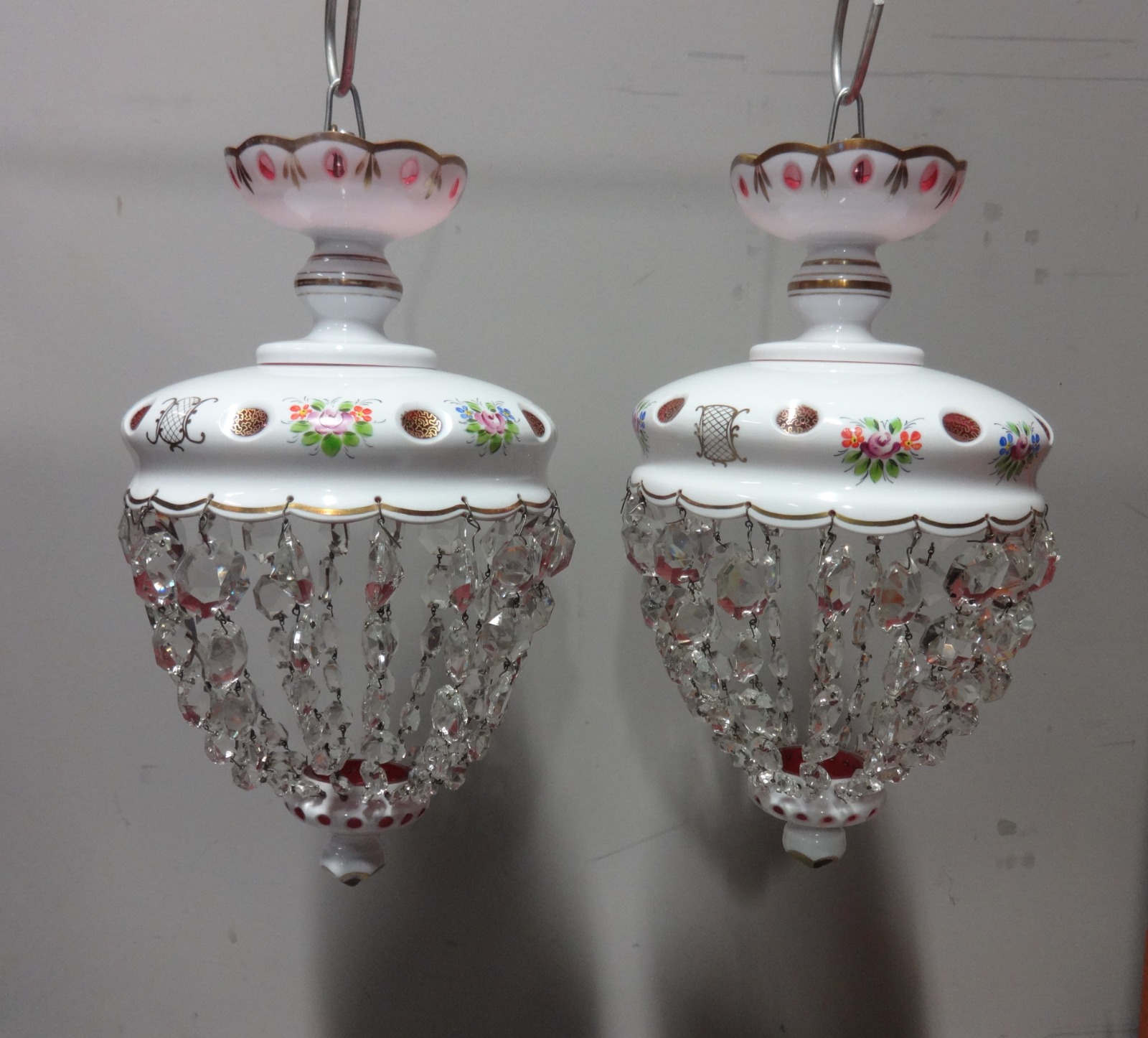 A very nice pair of cranberry lights with overlay white enamel and handpainted flowers, cut glass baskets with overlaid cranberry ends. In excellent condition.