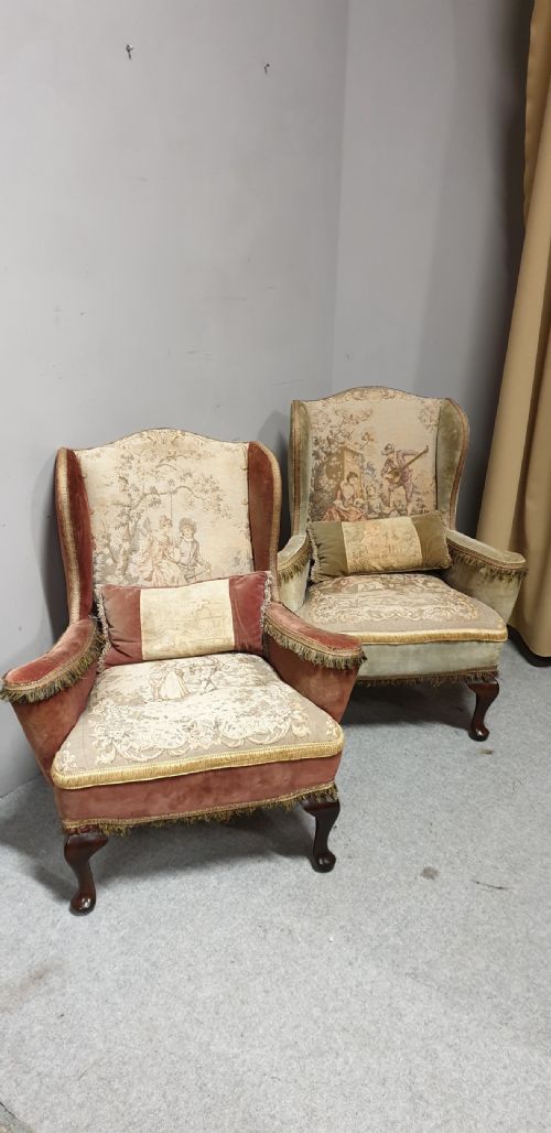 A very nice pair of antique outswept arm wing armchairs, with original velvet and tapestry upholstery and matching cushions. In very good condition.