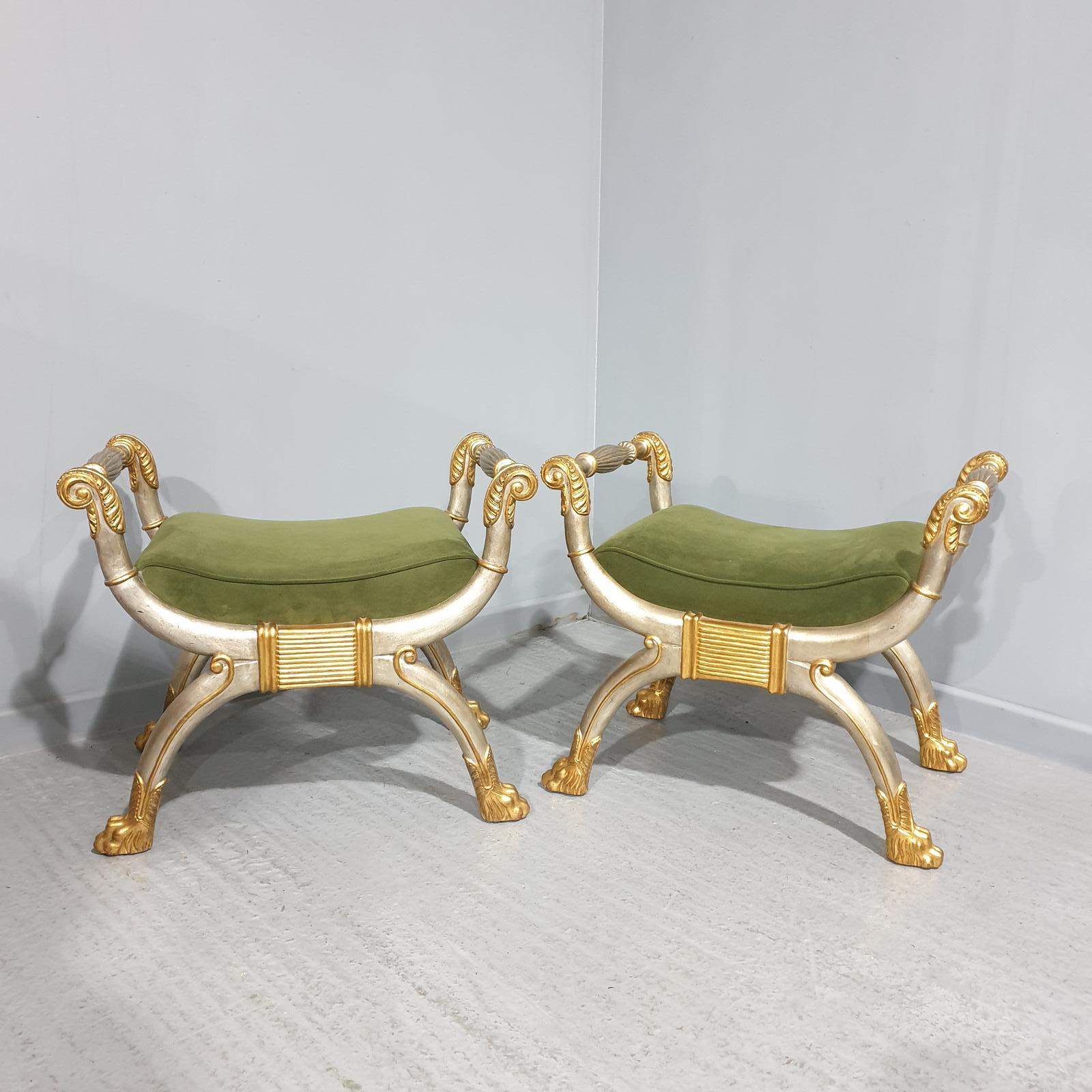 A very nice pair of X frame gilt and silver stools, lions paw feet, newly upholstered in green velvet, in excellent condition.