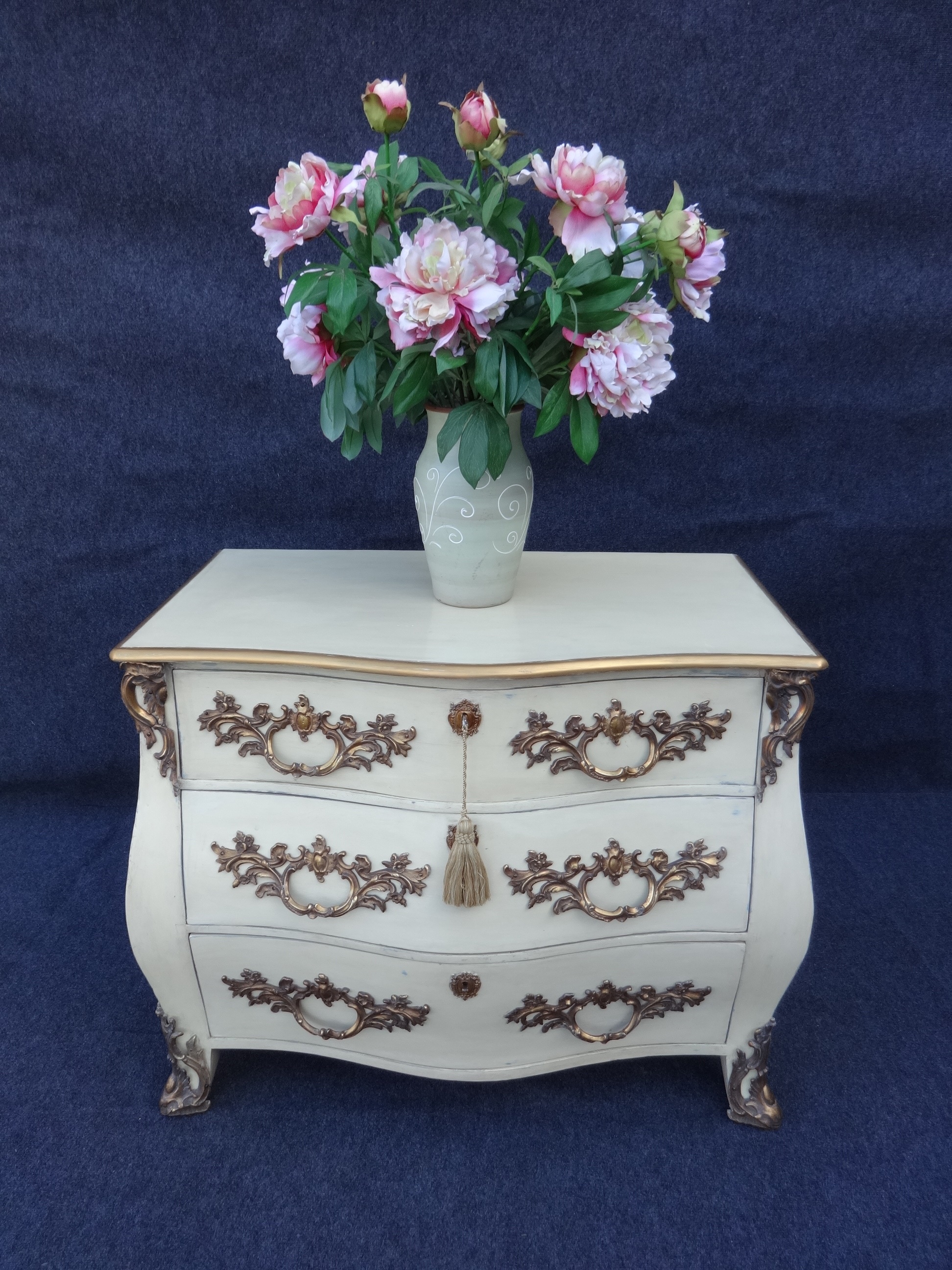 Offered for sale is this fantastic period painted commode chest of drawers which has gilded bronze mounts, 3 drawer bombe shaped chest of drawers, oak lined with oak back and is painted cream.