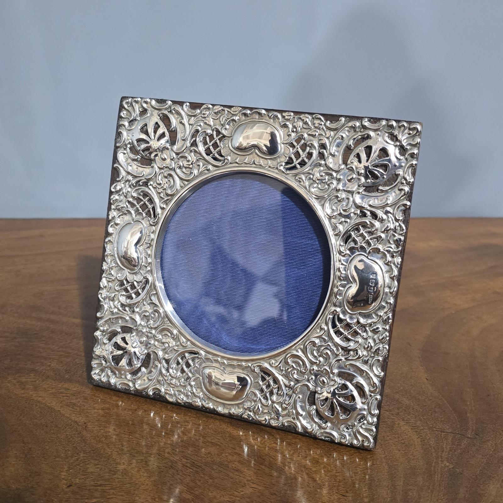 A lovely Rococo silver photo frame fully hallmarked 'E Mander & Son' Birmingham 1903, watered blue silk in excellent overall condition.