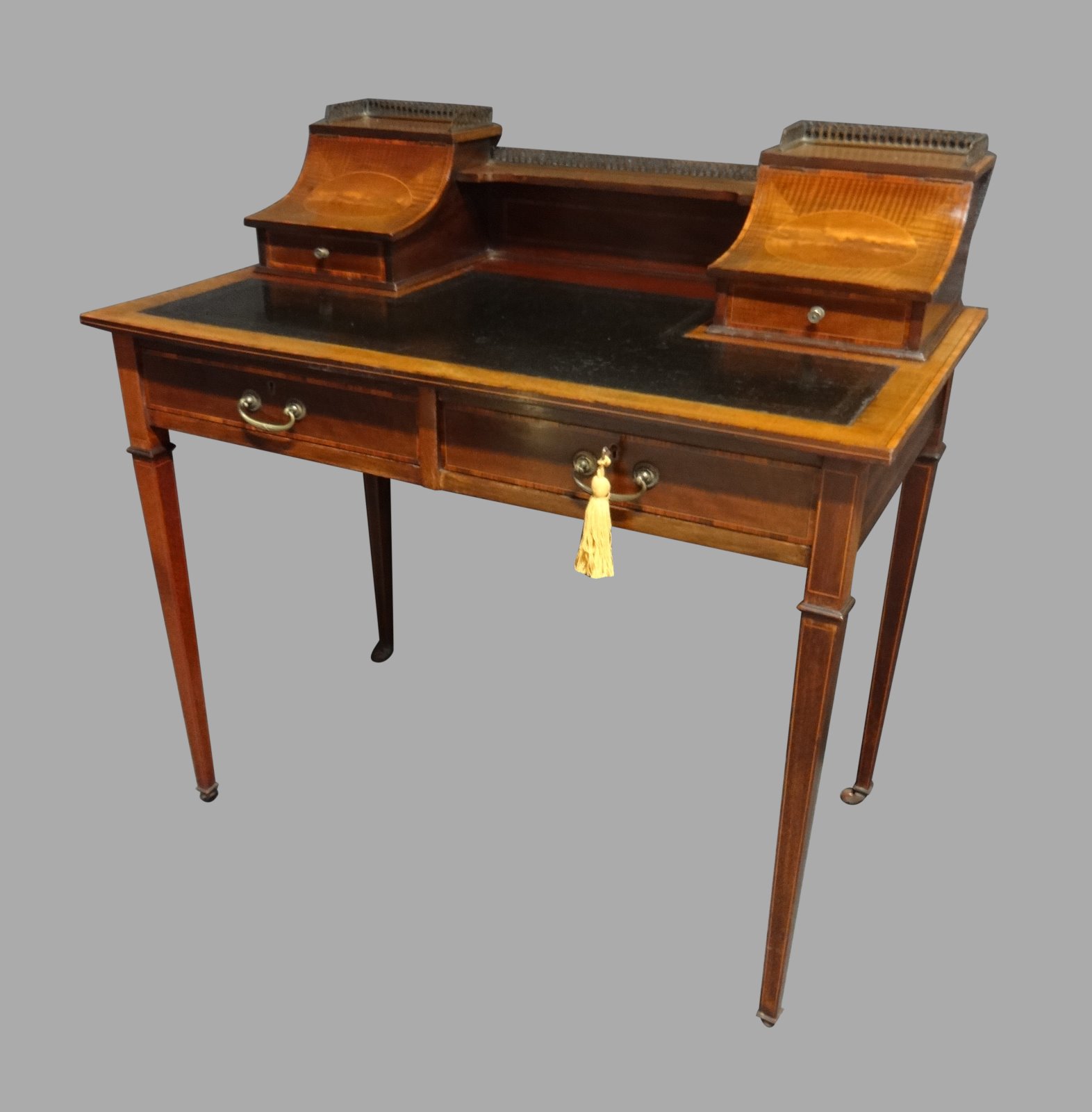 This is a very pretty inlaid mahogany two drawer Carlton House desk, with locking key, brass gallery to top, in very good original condition.