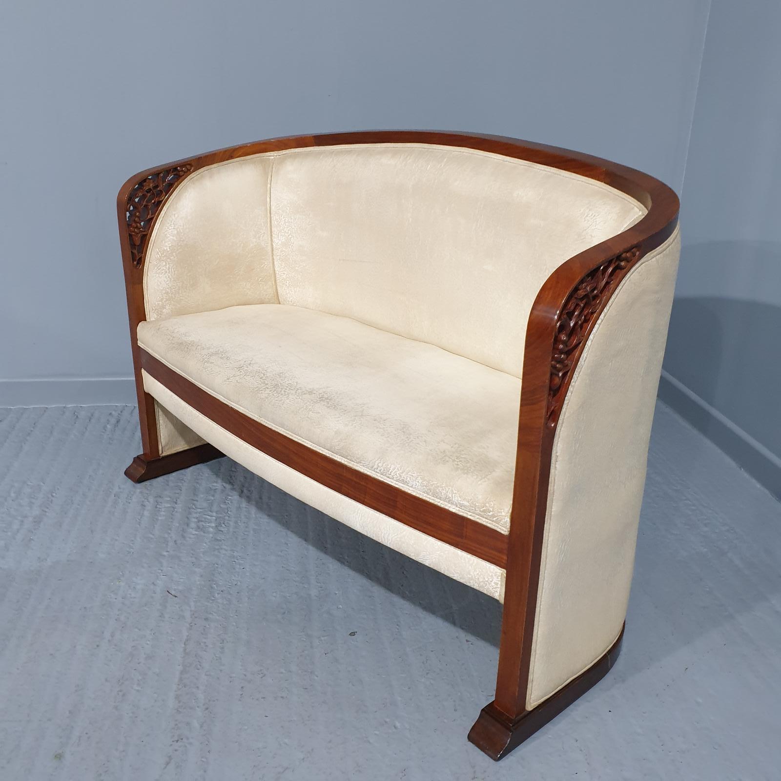 This is a very nice mahogany curved two seater couch with pierced detailing on the sides, in overall great condition.
