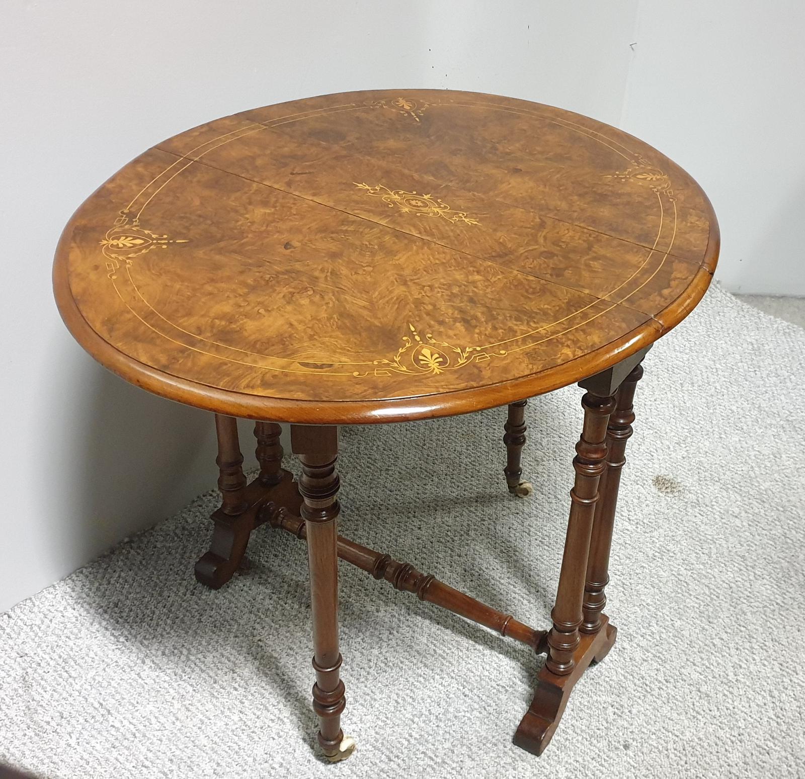 A very nice 19th Century Victorian antique burr walnut inlaid baby or miniature Sutherland table, with original white cup castors, in excellent original condition.