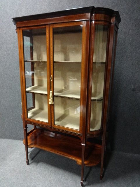 Excellent quality and condition, mahogany inlaid display cabinet, china cabinet, with 6 legs, bowed ends and relined in cream damask.