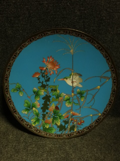 This is a quality Japanese cloisonné charger plate depicting a wren on a stem amongst flowers and foliage in excellent condition.