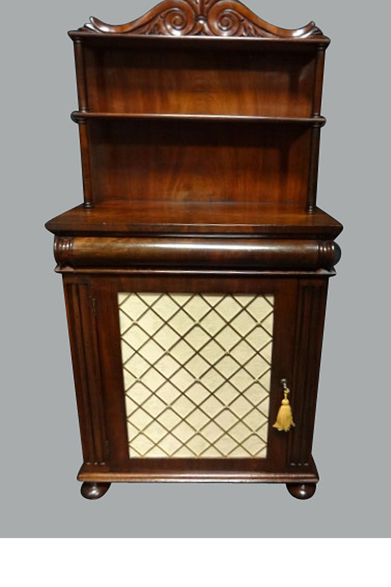 This is a very good mahogany chiffonier of small proportions, single cushion drawer and door with two shelves behind, standing on very pretty turned feet with brass grill, original locking key.