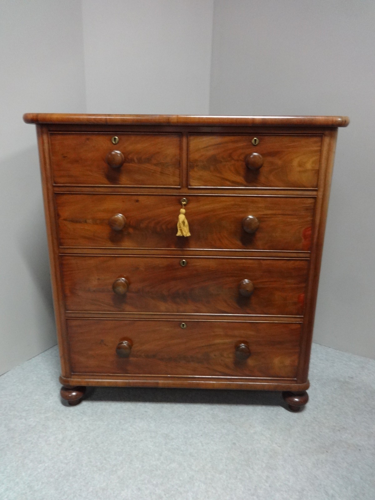 This is a top quality 19th Century Victorian antique solid mahogany chest of five drawers in superb original condition, with key.